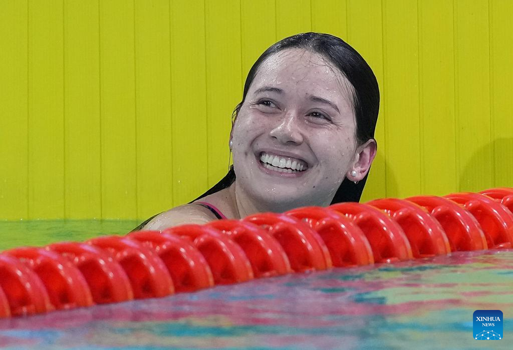 Siobhan Bernadette Haughey of Hong Kong reacts after the women's 200m freestyle final of swimming at China's 15th National Games in Shenzhen, south China's Guangdong Province, Nov. 13, 2025. (Xinhua/Du Yu)
