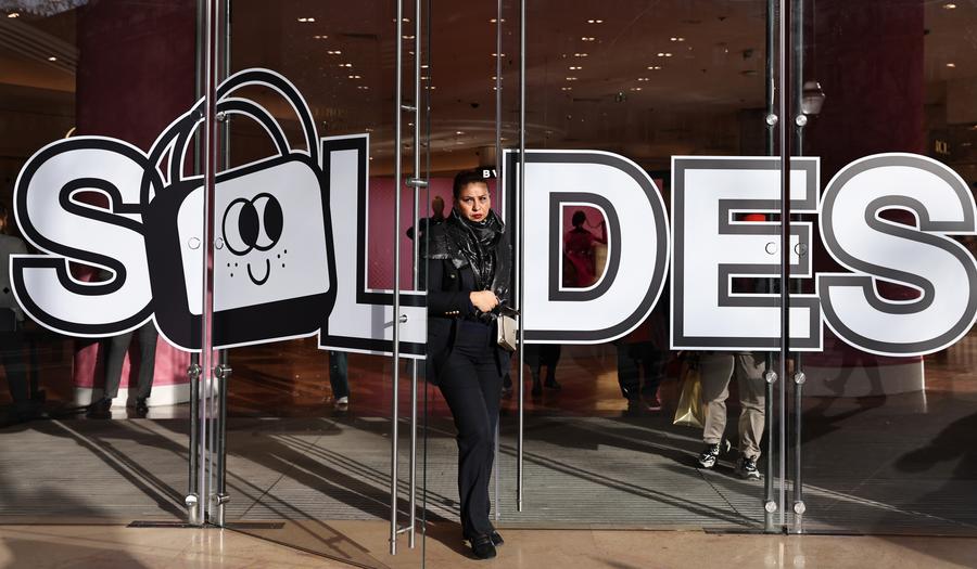 A customer walks out of the Galeries Lafayette Haussmann department store with winter sales signs on its gates in Paris, France, Jan. 10, 2025  (Xinhua/Gao Jing)