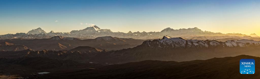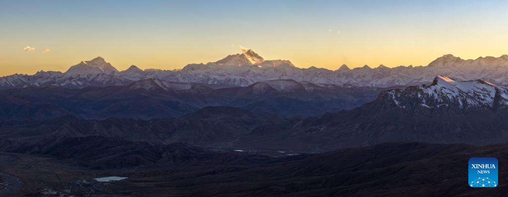 A drone photo taken on Nov. 13, 2025 shows a dusk view of Mount Lhotse, Mount Qomolangma, Mount Cho Oyu, and Mount Shishapangma (L to R) in Tingri County of Xigaze, southwest China's Xizang Autonomous Region. (Xinhua/Jiang Fan)