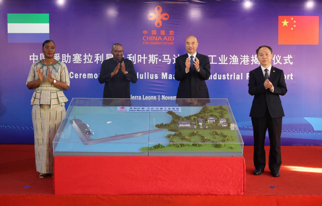 Chinese Vice Premier Liu Guozhong, also a member of the Political Bureau of the Communist Party of China (CPC) Central Committee, and Sierra Leonean Vice President Mohamed Juldeh Jalloh jointly attend the inauguration of a Chinese-aided fishing port in Freetown, Sierra Leone, Nov. 13, 2025. Liu was on a visit to Sierra Leone from Wednesday to Friday at the West African nation's invitation. (Xinhua/Gao Jianfei)