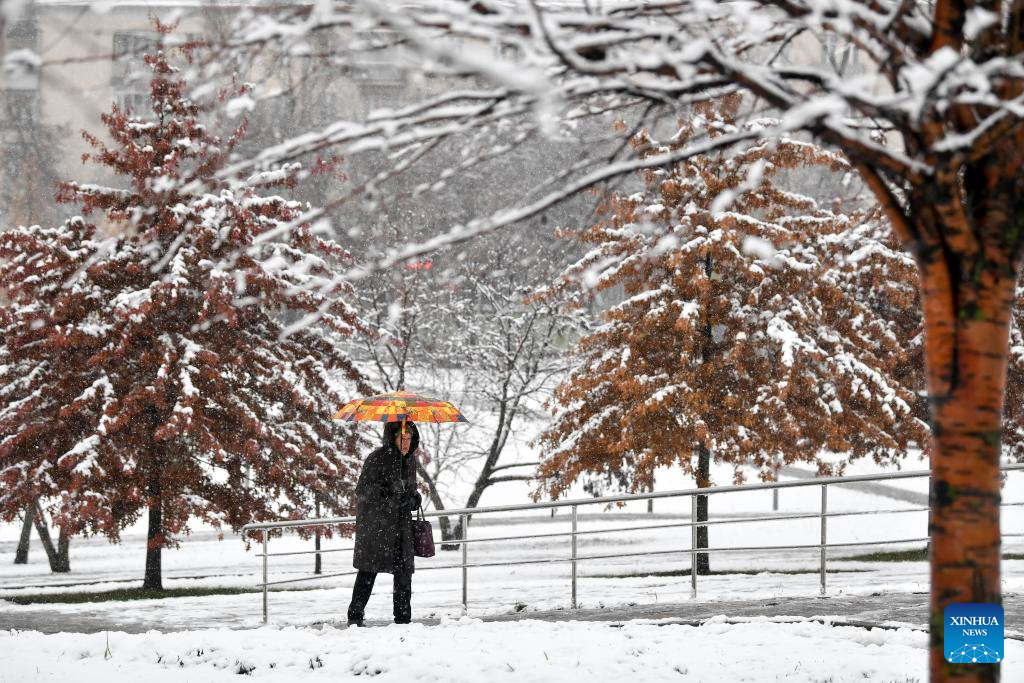 A woman walks in snow in Moscow, Russia, on Nov. 15, 2025. Moscow on Friday saw its first snowfall since the beginning of winter this year. (Photo by Alexander Zemlianichenko Jr/Xinhua)