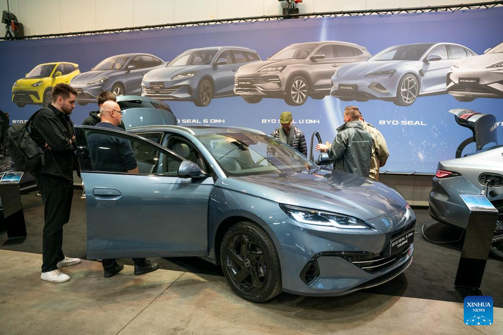 People visit the exhibition area of BYD at the 7th e-SALON in Prague, the Czech Republic, Nov. 14, 2025.