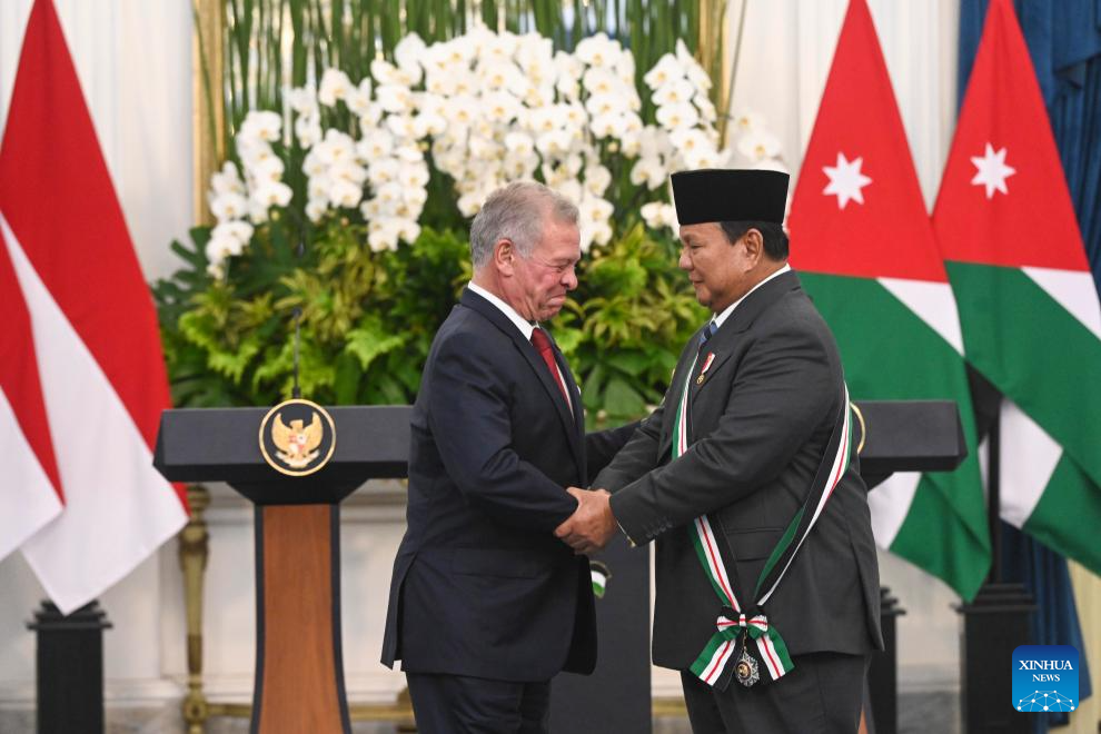 Indonesian President Prabowo Subianto (R) shakes hands with visiting King Abdullah II of Jordan at Merdeka palace in Jakarta, Indonesia, Nov. 14, 2025. (Photo by Zulkarnain/Xinhua)