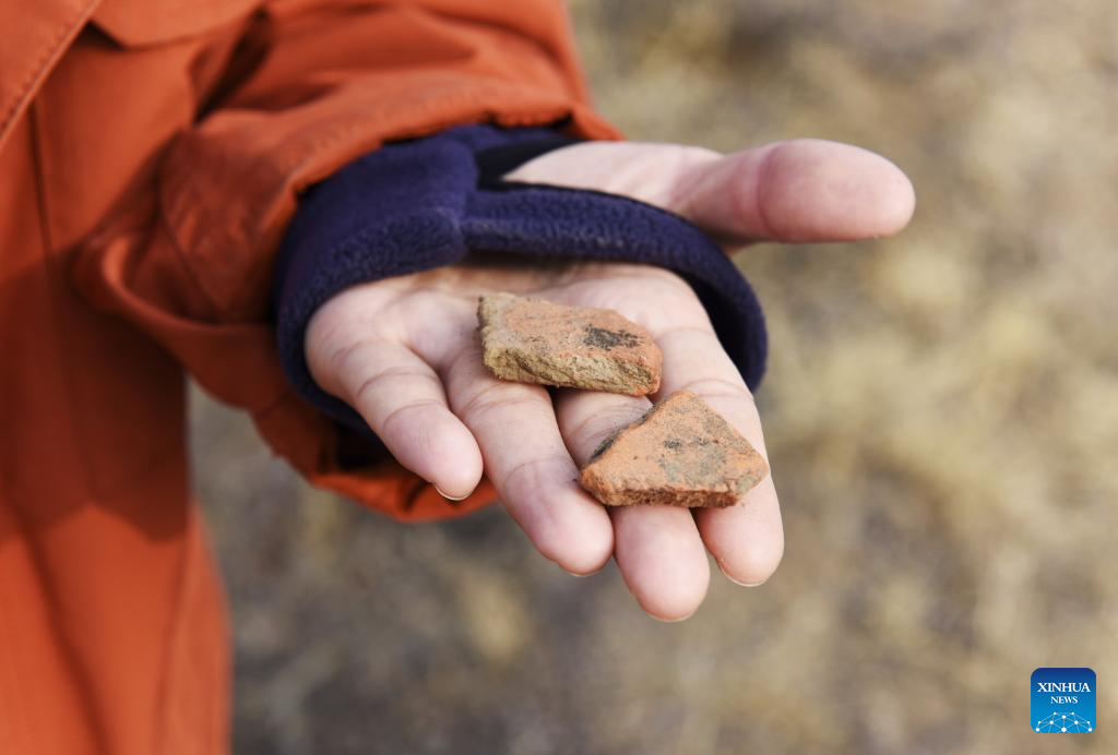 Yu Huaishi displays pottery fragments found during her survey in Chaoyang City, northeast China's Liaoning Province, March 11, 2025. (Xinhua/Wu Qinghao)