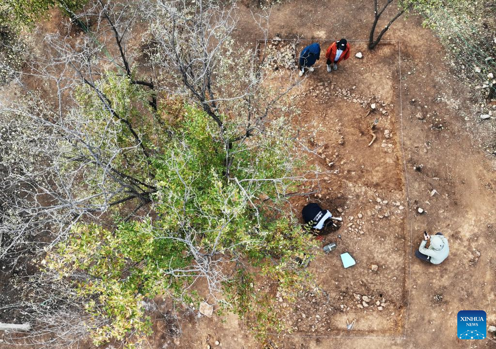 An aerial drone photo taken on Oct. 24, 2025 shows Yu Huaishi (R, above) and her colleagues working at the Niuheliang relic site in Chaoyang City, northeast China's Liaoning Province. (Xinhua/Li Gang)