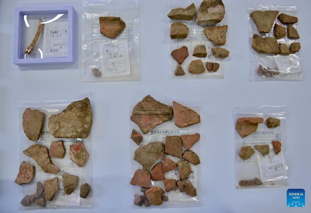 Pottery fragments and bone relics are pictured at a work station of the Niuheliang relic site in Chaoyang City, northeast China's Liaoning Province, Sept. 28, 2025. (Xinhua/Wu Qinghao)