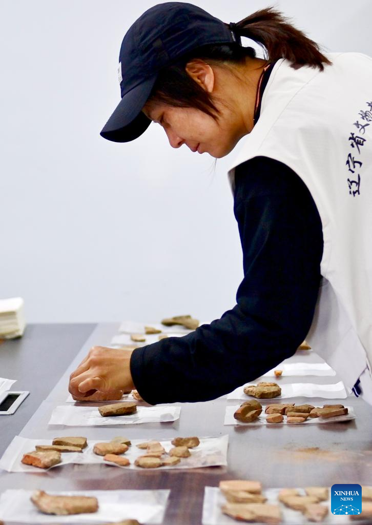 A staff member sorts pottery fragments at a work station of the Niuheliang relic site in Chaoyang City, northeast China's Liaoning Province, Oct. 23, 2025. (Xinhua/Li Gang)