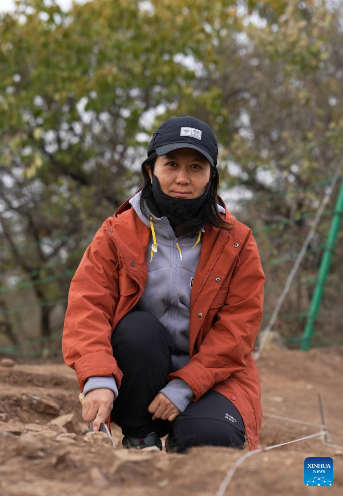 Yu Huaishi and her colleagues work at the Niuheliang relic site in Chaoyang City, northeast China's Liaoning Province, Nov. 12, 2025. (Xinhua/Li Gang)