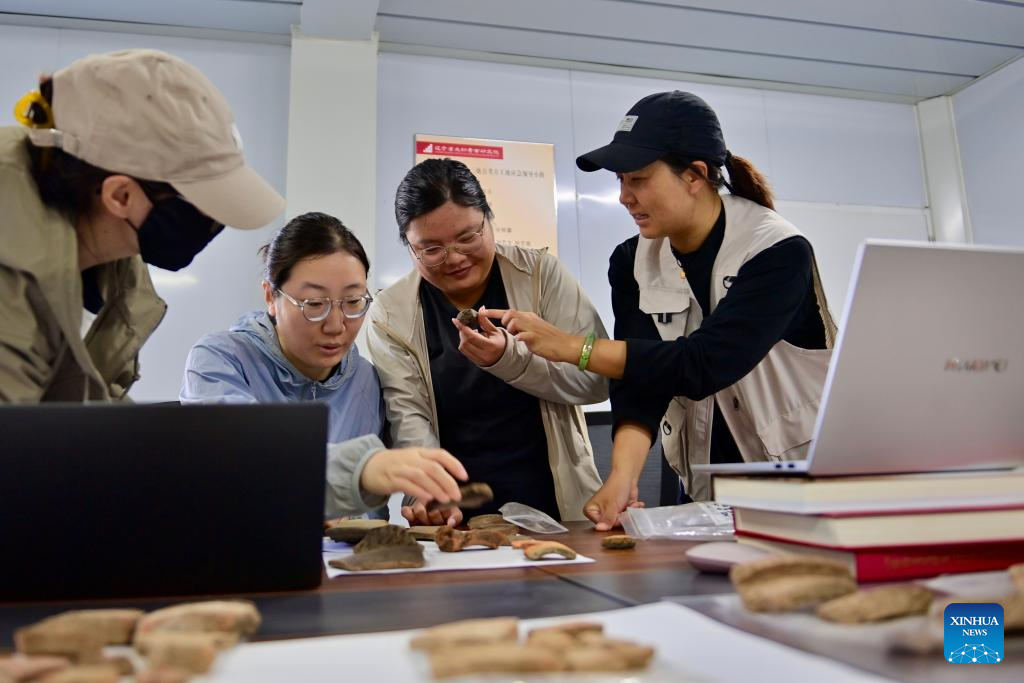 Yu Huaishi (1st R) and her colleagues identify a relic at a work station of the Niuheliang relic site in Chaoyang City, northeast China's Liaoning Province, Sept. 28, 2025. (Xinhua/Wu Qinghao)