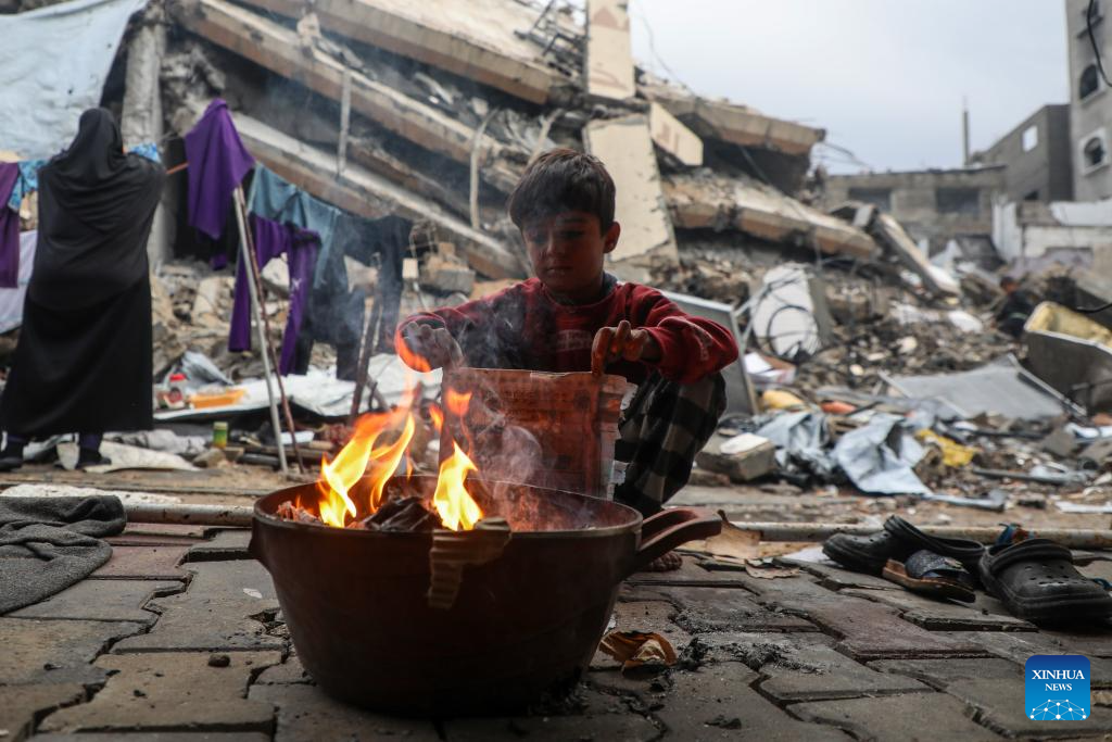 A Palestinian boy sits near a brazier to stay warm during a rainy day at a temporary shelter near the beach in Gaza City, on Nov. 14, 2025. (Photo by Rizek Abdeljawad/Xinhua)