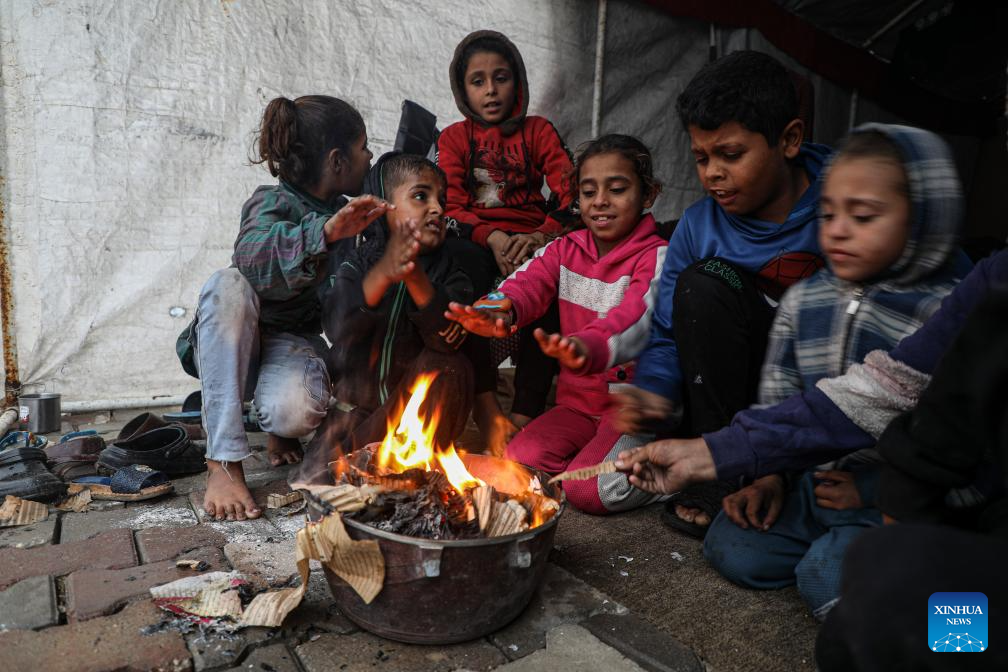 GAZA, Nov. 14 (Xinhua) -- Displaced Palestinians awoke to flooded tents Friday morning as the first autumn rain hit the Gaza Strip overnight, heightening fears of worsening living conditions as winter approaches.