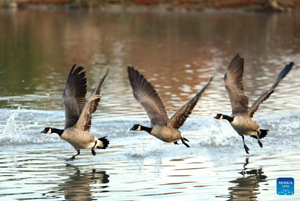 Canada geese (Branta canadensis) migrating to the east coast of the United States are pictured at Berczy Park North in Markham, Ontario, Canada, Nov. 14, 2025. (Photo by Yang Shu/Xinhua)