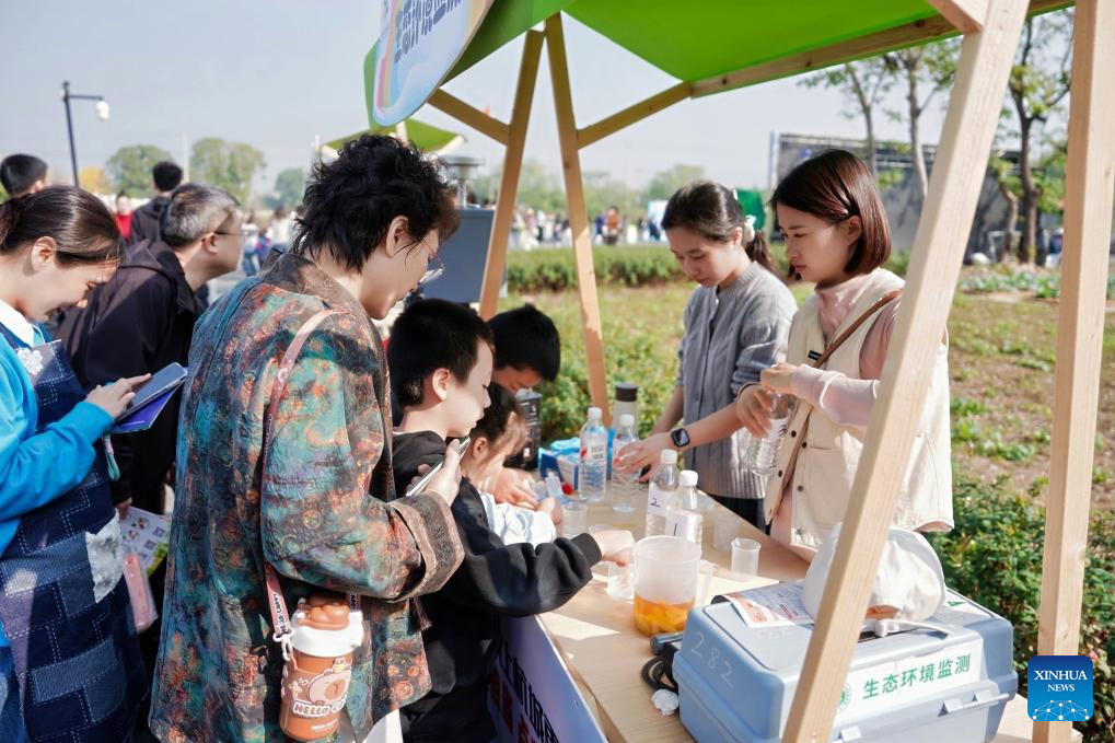 Children try water quality testing during an event of the World Children's Day in Hangzhou, east China's Zhejiang Province, on Nov. 15, 2025. The World Children's Day will fall on Nov. 20 this year. Various activities were held across the country to hail the arrival of the day. (Xinhua)