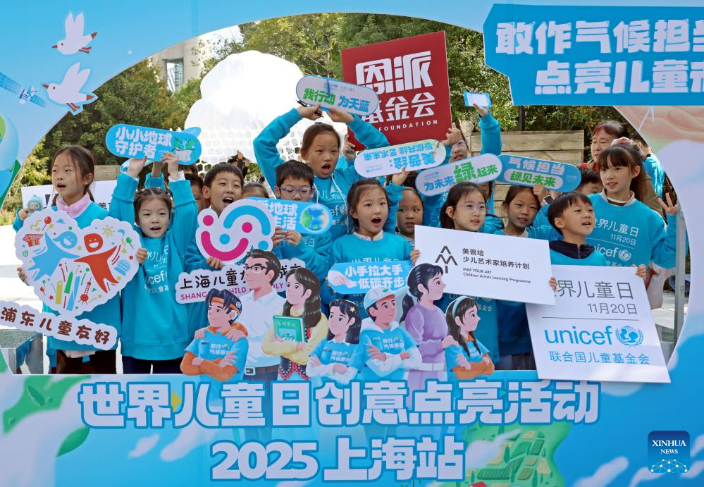 Children take a group photo during an event of the World Children's Day in east China's Shanghai, on Nov. 15, 2025. The World Children's Day will fall on Nov. 20 this year. Various activities were held across the country to hail the arrival of the day. (Photo by Pan Zongyuan/Xinhua)