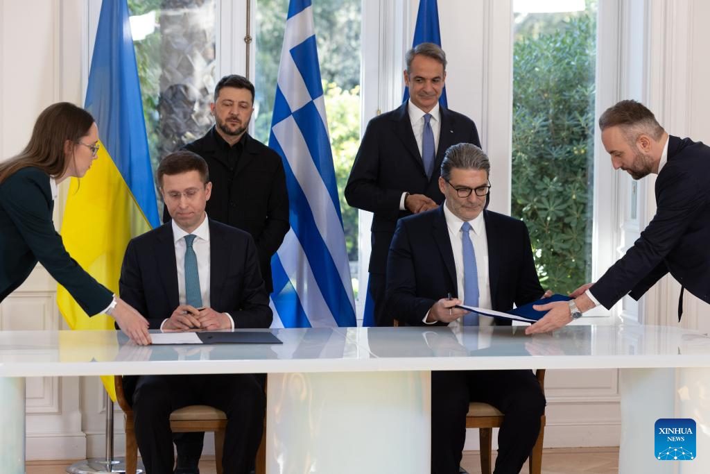 The agreement was signed in Athens in the presence of Greek Prime Minister Kyriakos Mitsotakis and Zelensky. (Photo by Lefteris Partsalis/Xinhua)