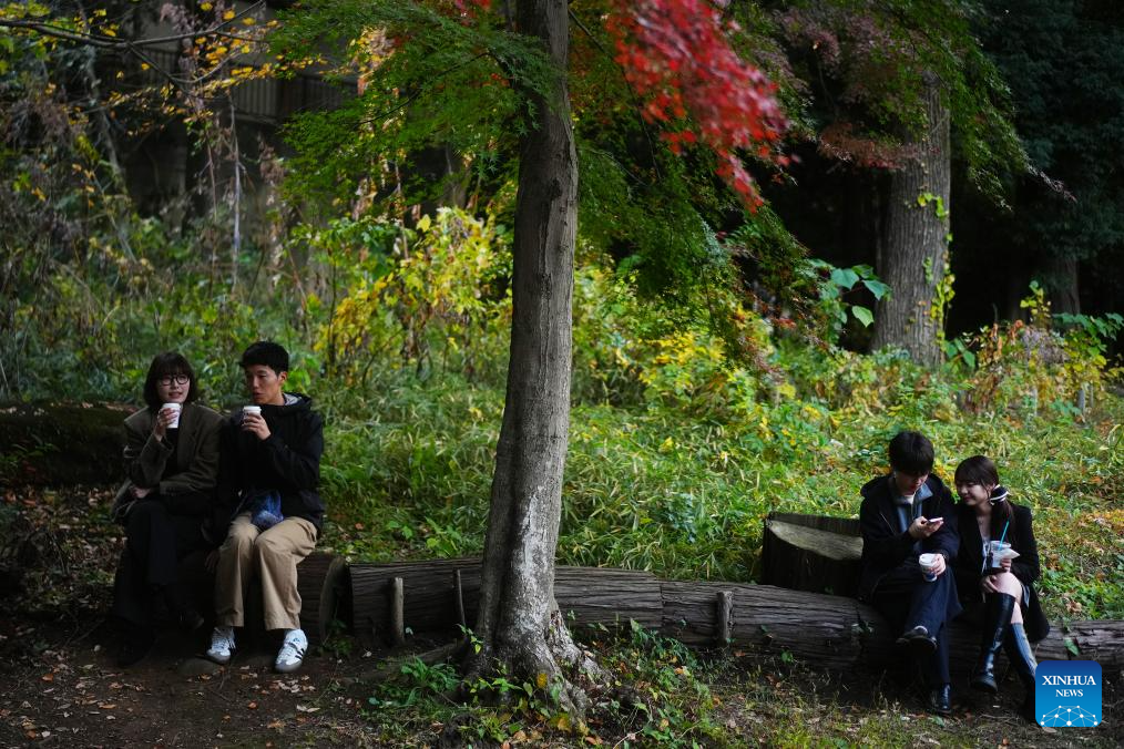 Tourists rest at a park in Tokyo, Japan, Nov. 16, 2025. Tokyo stocks extended losses on Monday, weighed down by broad selling in inbound-related stocks. (Xinhua/Jia Haocheng)