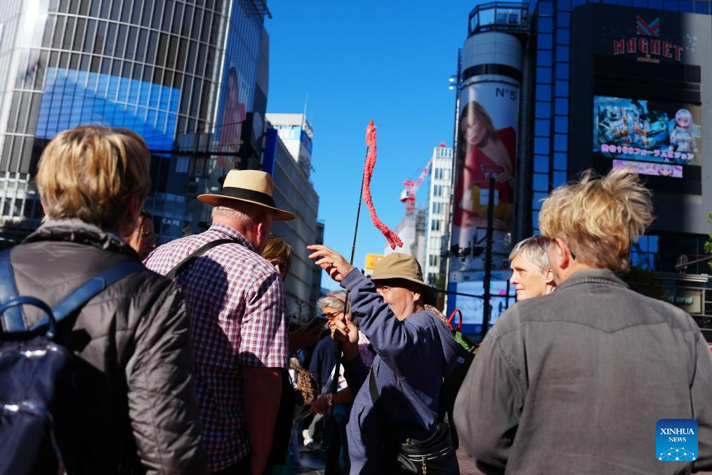 Tourists are seen near the Shibuya Station in Tokyo, Japan, Nov. 17, 2025. Tokyo stocks extended losses on Monday, weighed down by broad selling in inbound-related stocks. (Xinhua/Jia Haocheng)