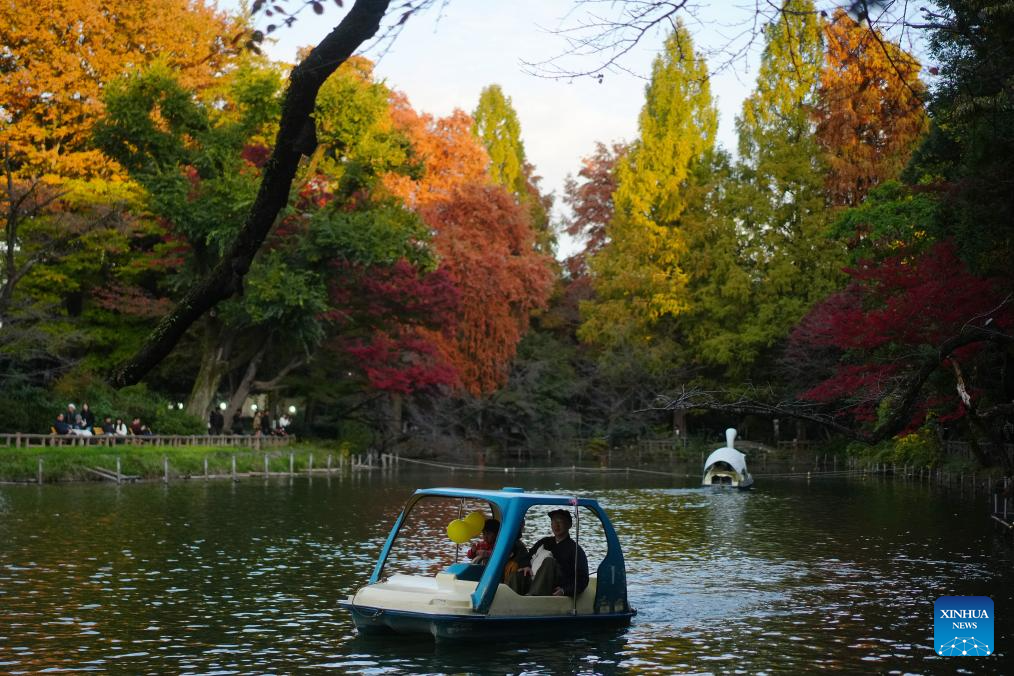 Tourists take a boat for sightseeing at a park in Tokyo, Japan, Nov. 16, 2025. Tokyo stocks extended losses on Monday, weighed down by broad selling in inbound-related stocks. (Xinhua/Jia Haocheng)