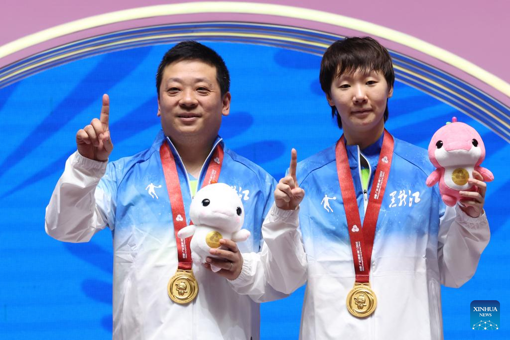 Gold medalist Wang Manyu (R) of Heilongjiang pose with her coach during the awarding ceremony for the table tennis women's singles at China's 15th National Games in Macao, south China, Nov. 16, 2025. (Xinhua/Liang Xu)