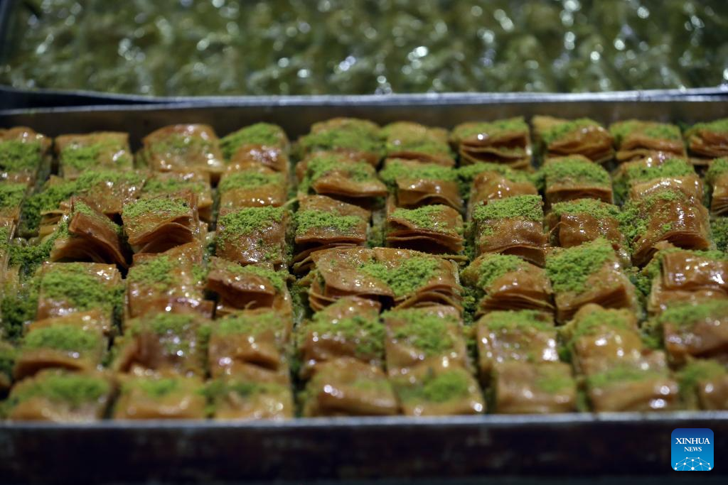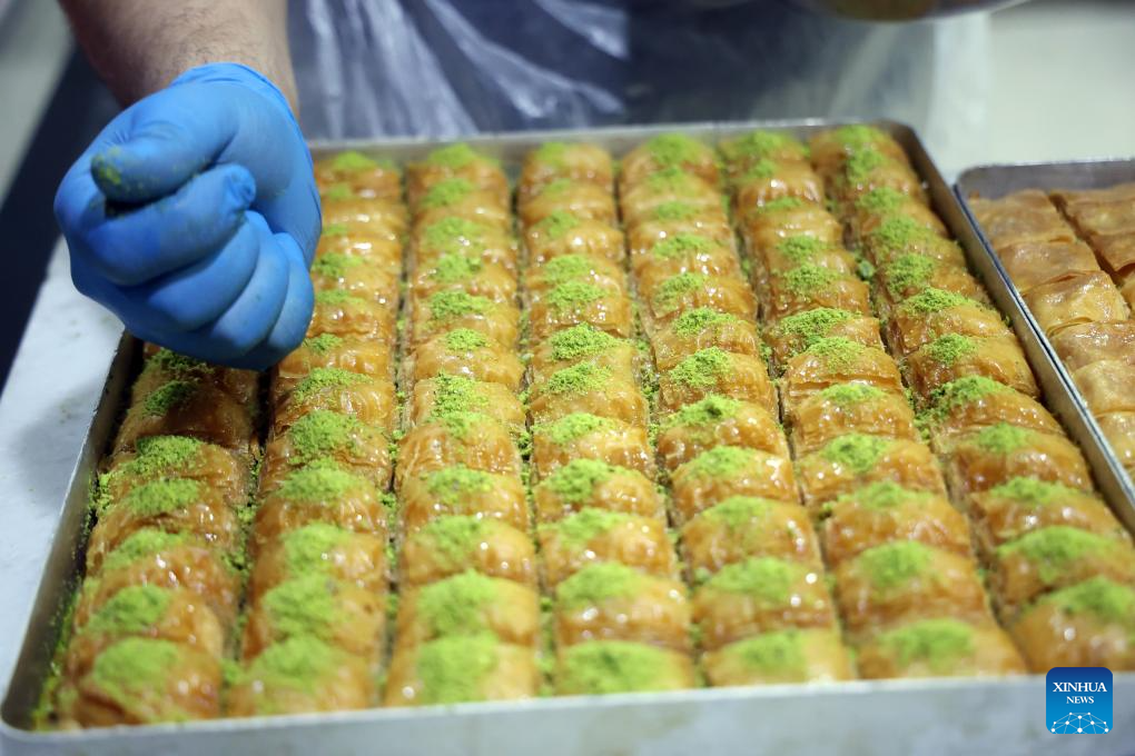 A baker makes baklavas, a traditional Turkish dessert, in Ankara, Türkiye, Nov. 14, 2025. Baklava is a sweet Turkish pastry with layers of filled dough, butter and the smell of sweet syrup. (Mustafa Kaya/Handout via Xinhua)