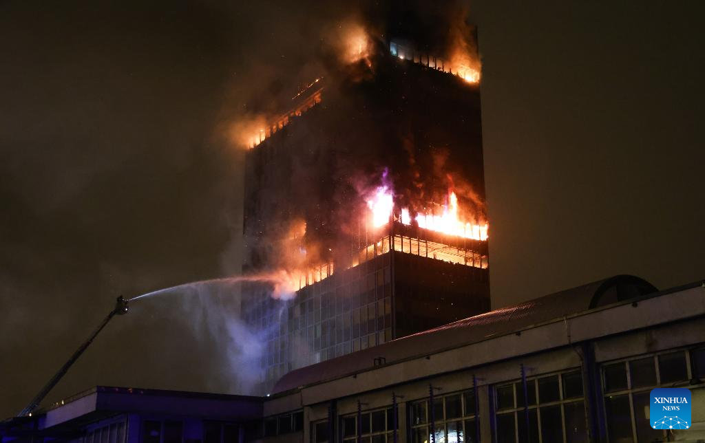 Firefighters work to extinguish the fire of the Vjesnik skyscraper in Zagreb, Croatia, Nov. 18, 2025 . One of the tallest buildings in Croatia caught fire shortly before midnight on Monday and continues to burn Tuesday morning, local media reported. (Matija Habljak/PIXSELL via Xinhua)