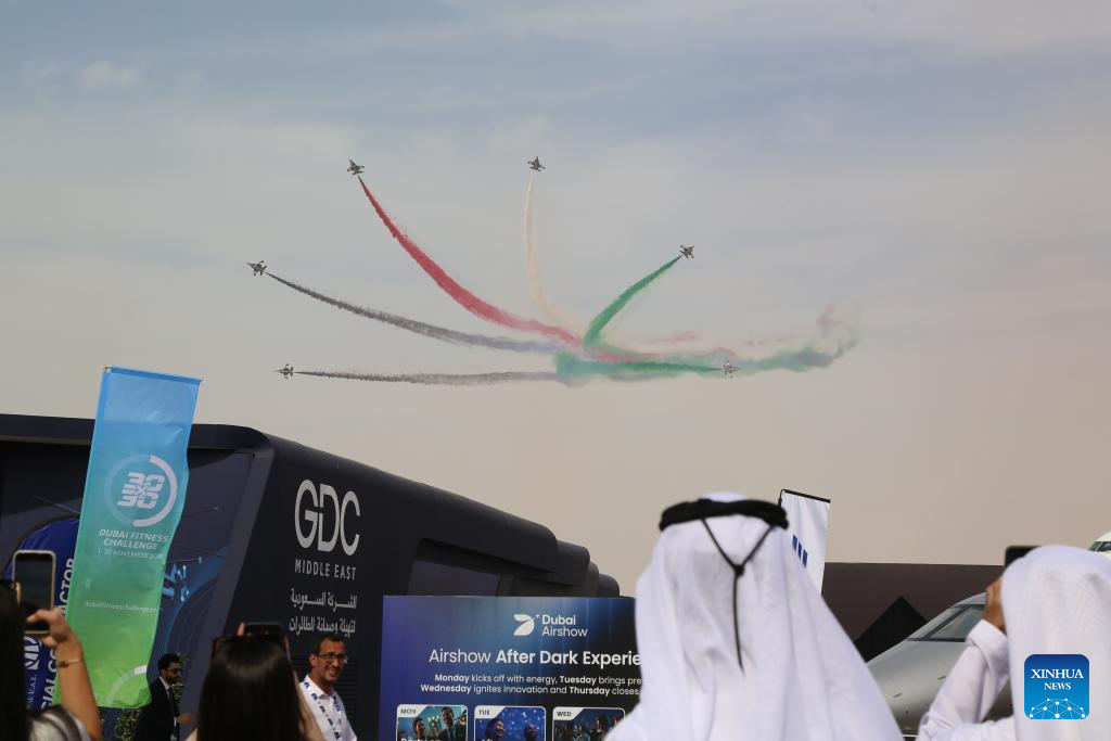 Aircraft perform during the 19th edition of the Dubai Airshow in Dubai, the United Arab Emirates (UAE), Nov. 17, 2025. The 19th edition of the Dubai Airshow opened Monday at Dubai World Central, featuring the Middle East debut of two of China's homegrown C919 aircraft.