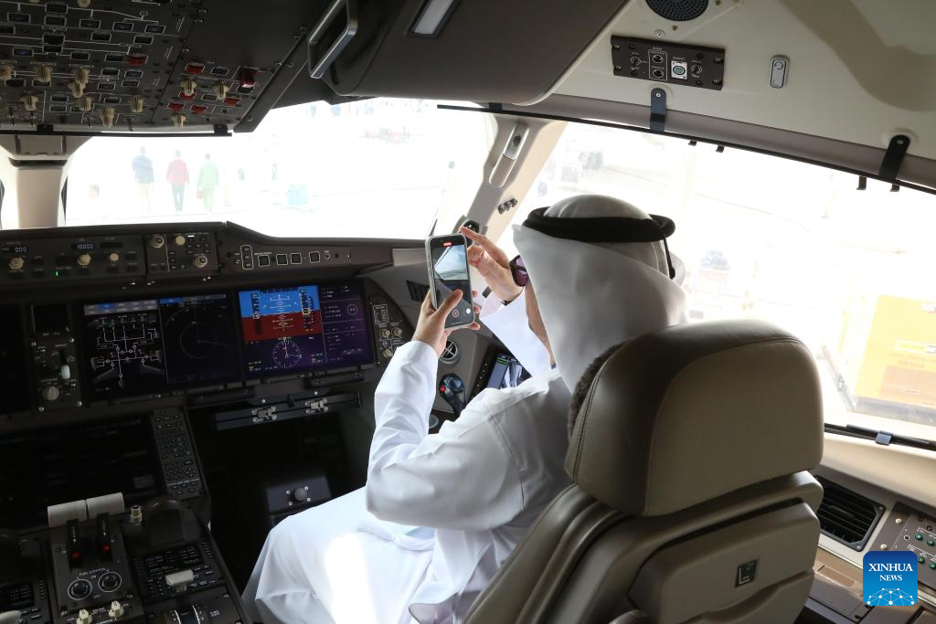 A UAE visitor sits on a C919 aircraft during the 19th edition of the Dubai Airshow in Dubai, the United Arab Emirates (UAE), Nov. 17, 2025. The 19th edition of the Dubai Airshow opened Monday at Dubai World Central, featuring the Middle East debut of two of China's homegrown C919 aircraft.