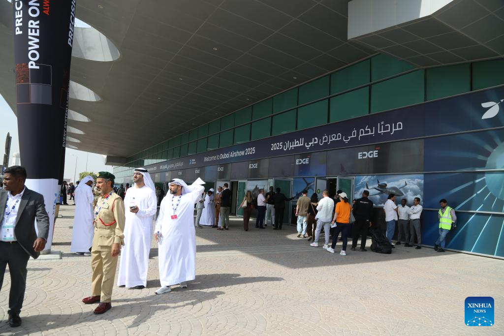 People visit the 19th edition of the Dubai Airshow in Dubai, the United Arab Emirates (UAE) on Nov. 17, 2025. The 19th edition of the Dubai Airshow opened Monday at Dubai World Central, featuring the Middle East debut of two of China's homegrown C919 aircraft.