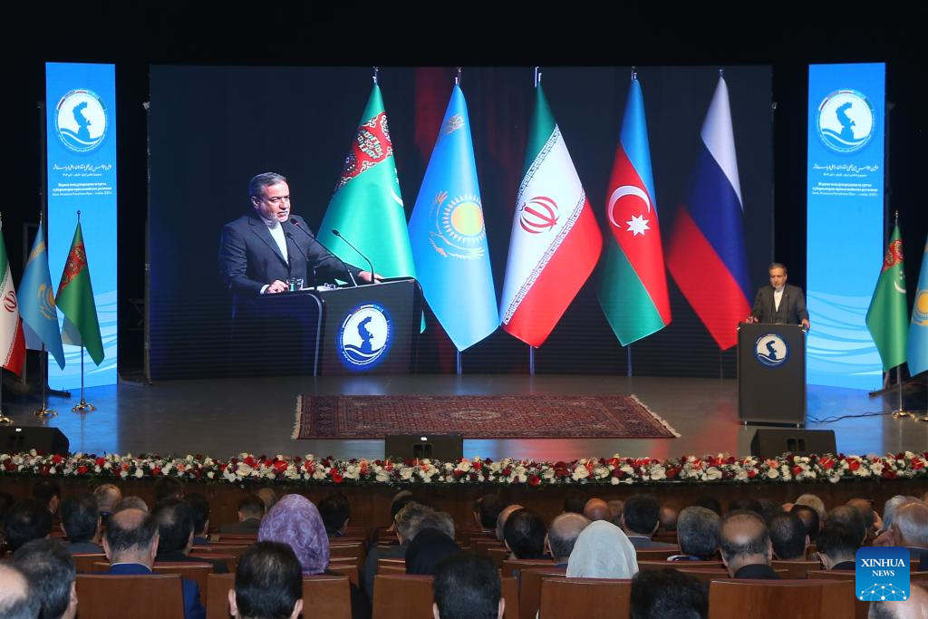 Iranian Foreign Minister Seyed Abbas Araghchi speaks during a press conference of the First Caspian Governors' Forum in the northern city of Rasht, Iran, Nov. 18, 2025. Iran on Tuesday opened the First Caspian Governors' Forum in Rasht, aiming to strengthen regional cooperation among the Caspian Sea littoral states. (Xinhua/Shadati)