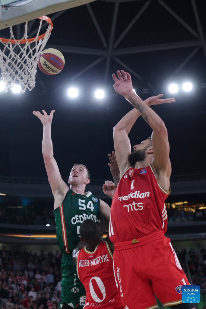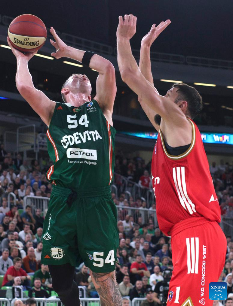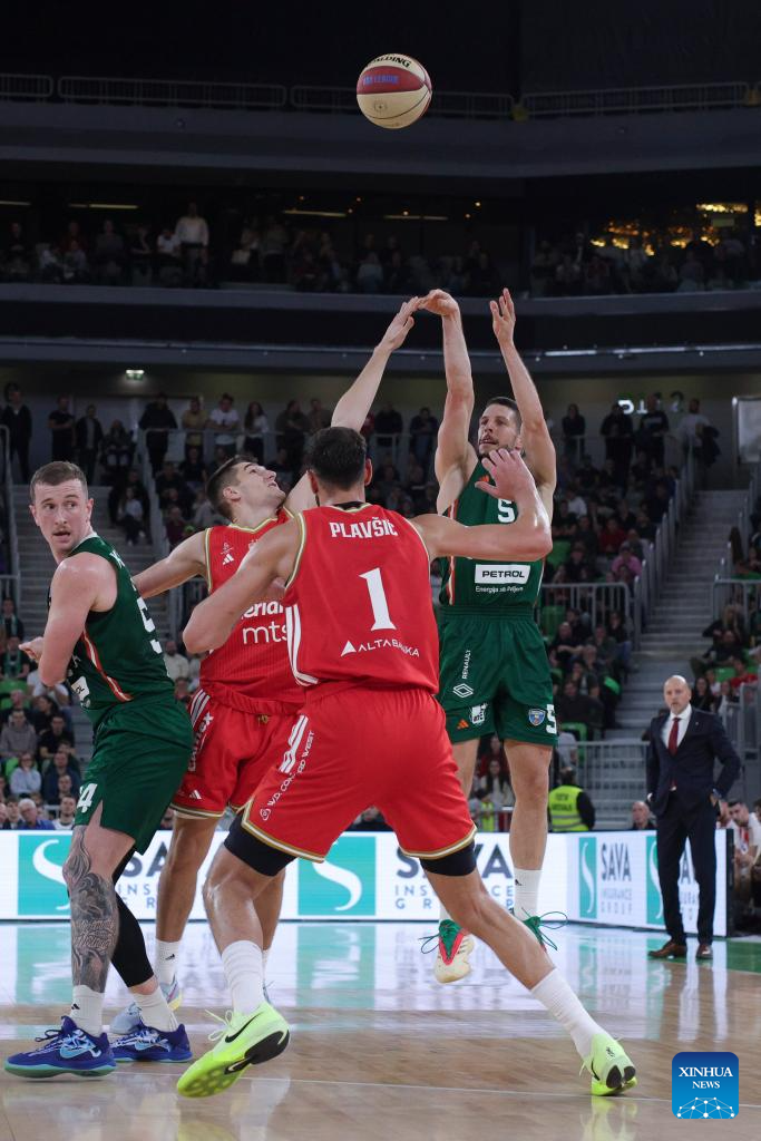 Aleksej Nikolic (1st R) of Cedevita Olimpija Ljubljana shoots during the ABA League basketball match between Cedevita Olimpija Ljubljana and Crvena Zvezda Meridianbet in Ljubljana, Slovenia, Nov. 17, 2025. (Photo by Zeljko Stevanic/Xinhua)
