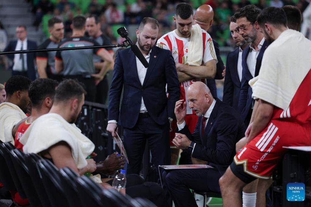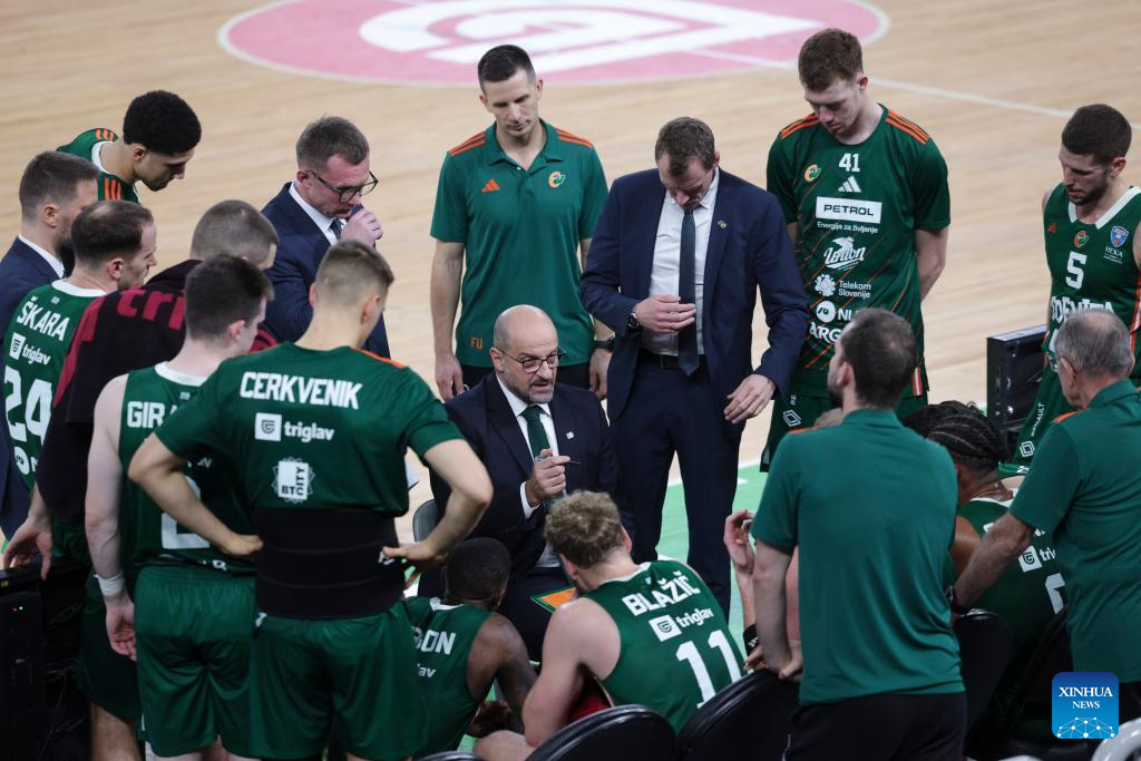 Zvezdan Mtrovic (C), head coach of Cedevita Olimpija Ljubljana, gives instructions to players during the ABA League basketball match between Cedevita Olimpija Ljubljana and Crvena Zvezda Meridianbet in Ljubljana, Slovenia, Nov. 17, 2025. (Photo by Zeljko Stevanic/Xinhua)