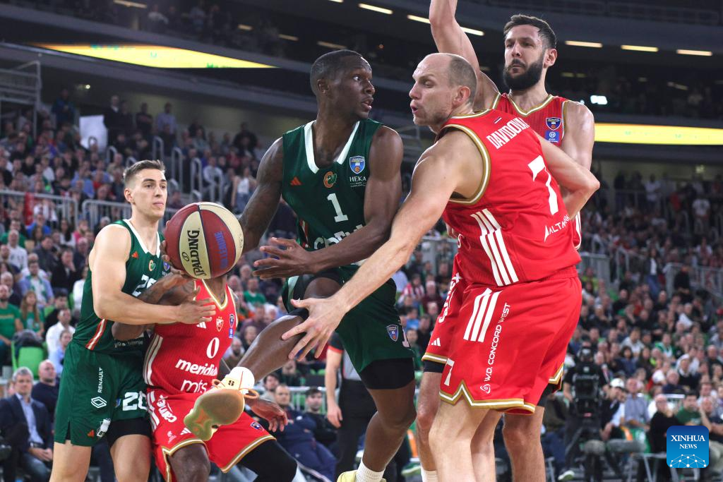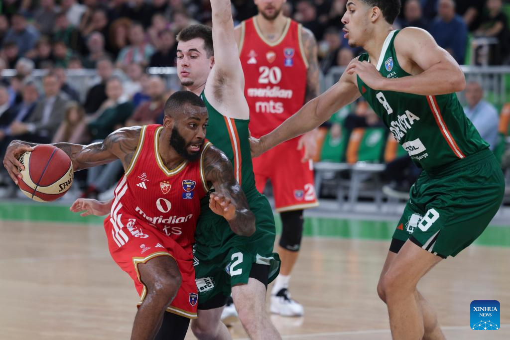 Umoja Adeyemi Gibson (3rd R) of Cedevita Olimpija Ljubljana competes during the ABA League basketball match between Cedevita Olimpija Ljubljana and Crvena Zvezda Meridianbet in Ljubljana, Slovenia, Nov. 17, 2025. (Photo by Zeljko Stevanic/Xinhua)