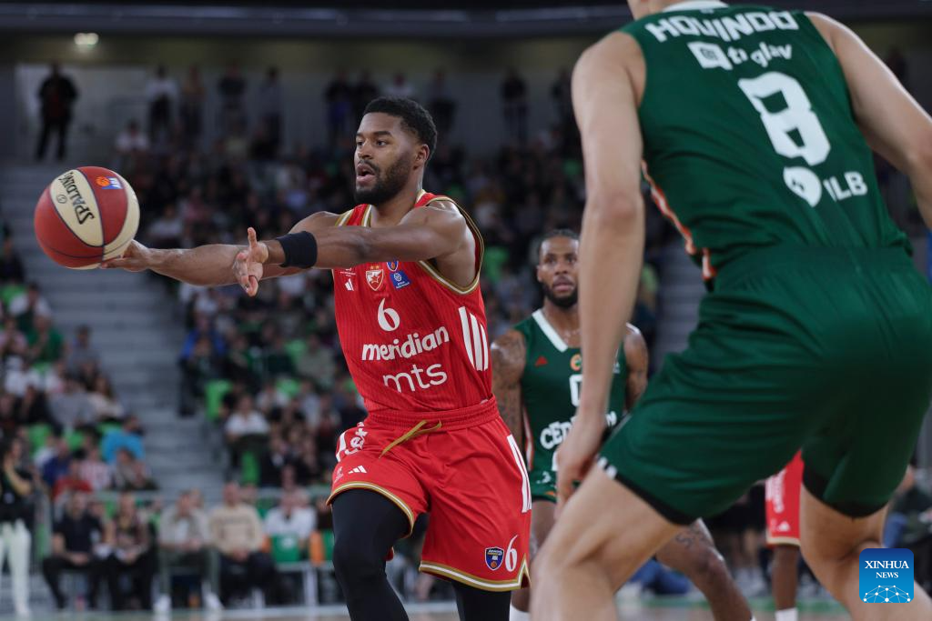 Jared Butler (L) of Crvena Zvezda Meridianbet passes the ball during the ABA League basketball match between Cedevita Olimpija Ljubljana and Crvena Zvezda Meridianbet in Ljubljana, Slovenia, Nov. 17, 2025. (Photo by Zeljko Stevanic/Xinhua)