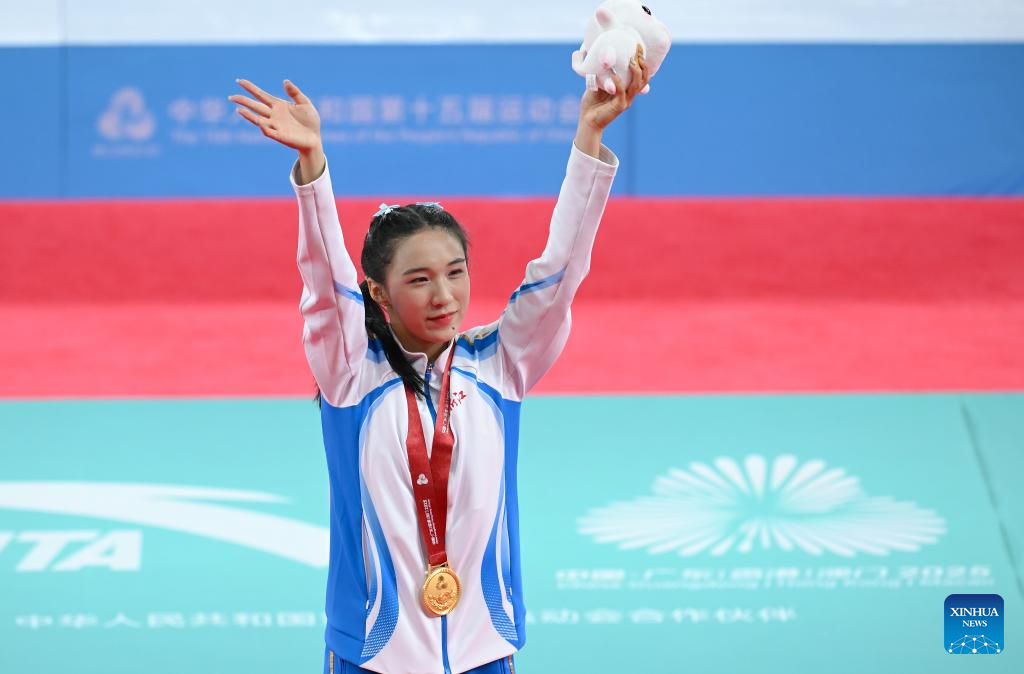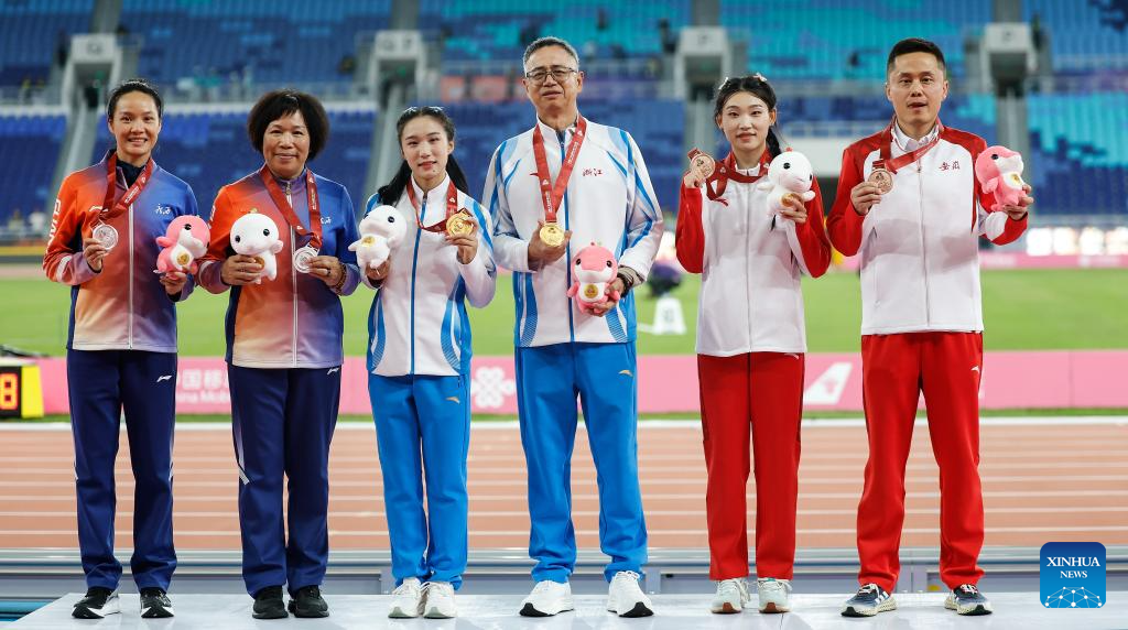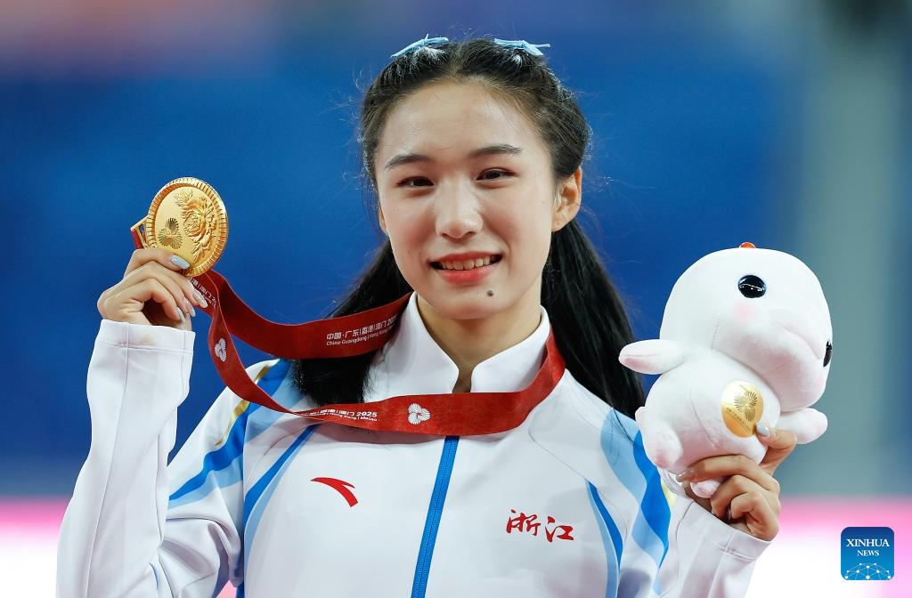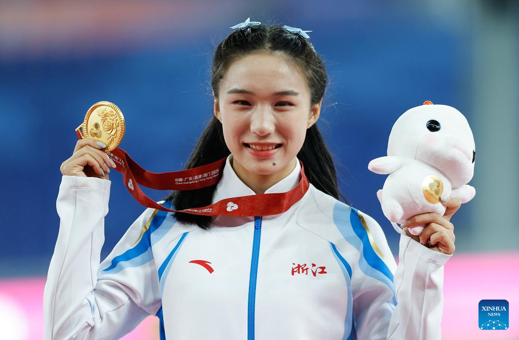 Gold medalist Chen Yujie of Zhejiang poses during the awarding ceremony of the women's 100m of athletics at China's 15th National Games in Guangzhou, south China's Guangdong Province, Nov. 17, 2025. (Xinhua/Huang Wei)