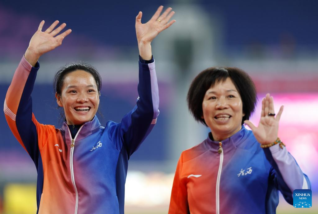 Silver medalist Wei Yongli of Guangxi and her coach pose during the awarding ceremony of the women's 100m of athletics at China's 15th National Games in Guangzhou, south China's Guangdong Province, Nov. 17, 2025. (Xinhua/Huang Wei)