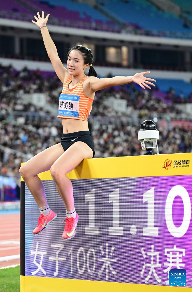 Gold medalist Chen Yujie of Zhejiang greets the spectators after the awarding ceremony of the women's 100m of athletics at China's 15th National Games in Guangzhou, south China's Guangdong Province, Nov. 17, 2025. (Xinhua/Zhou Mu)