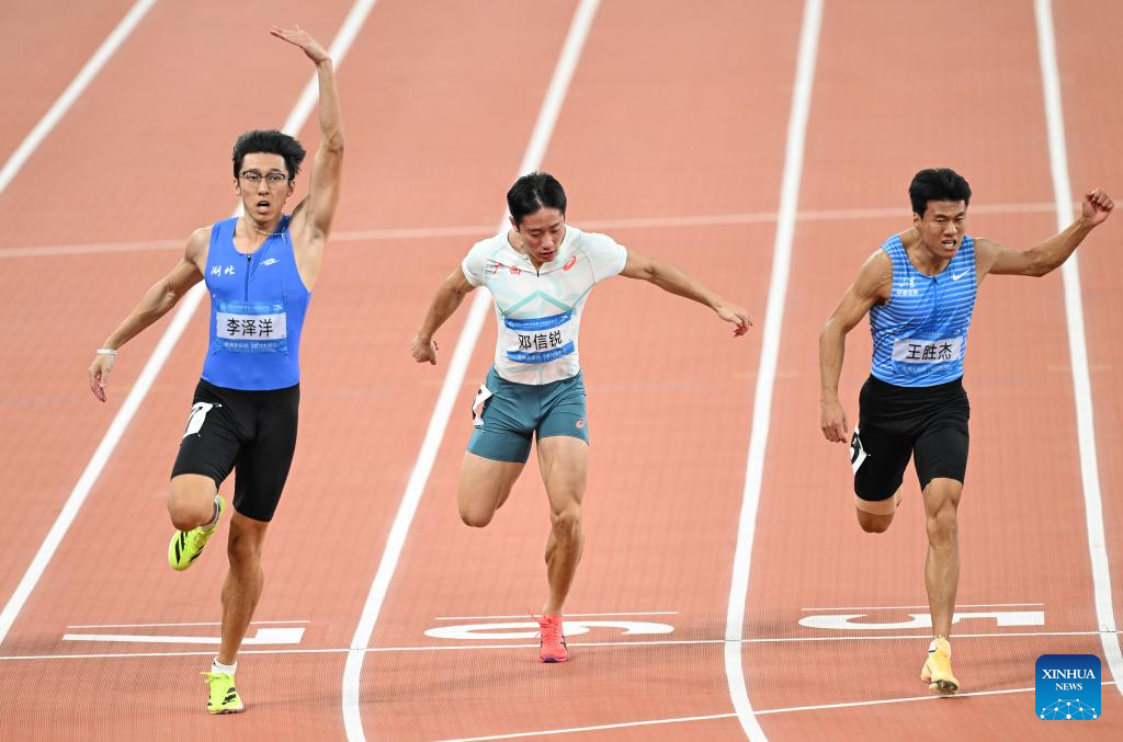 Li Zeyang (L) of Hubei, Deng Xinrui (C) of Guangxi and Wang Shengjie of Shandong cross the finish line during the men's 100m final of athletics at China's 15th National Games in Guangzhou, south China's Guangdong Province, Nov. 17, 2025. (Xinhua/Deng Hua)