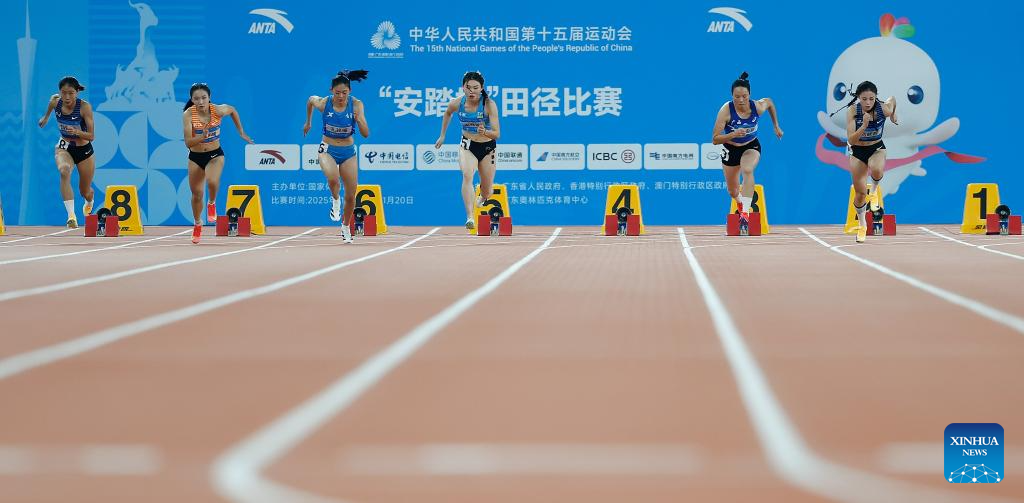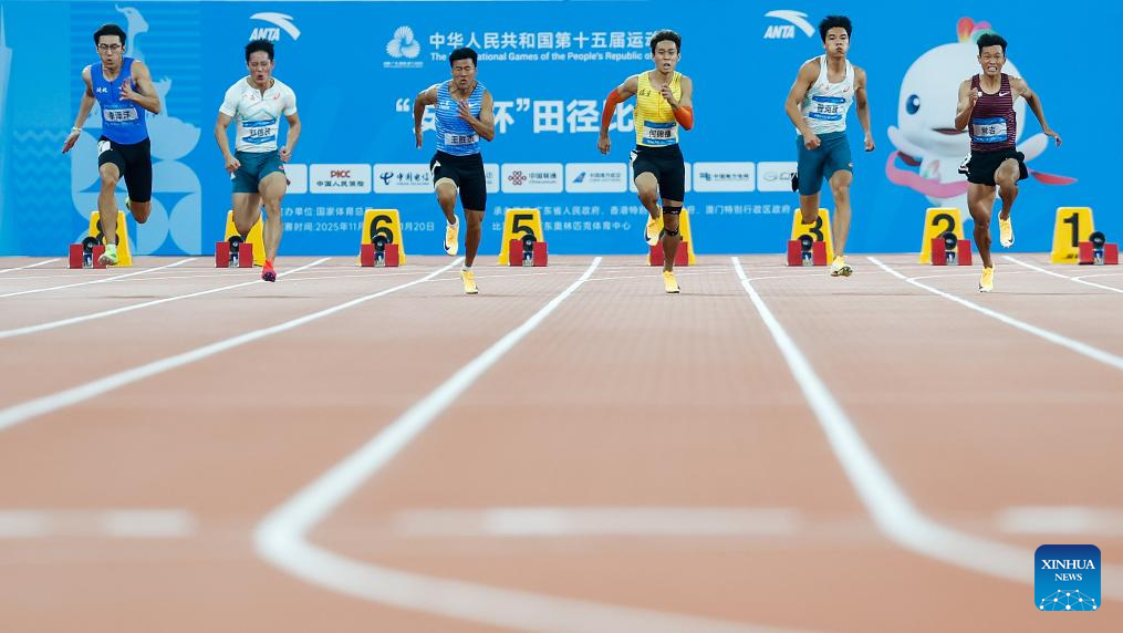 Athletes compete during the men's 100m final of athletics at China's 15th National Games in Guangzhou, south China's Guangdong Province, Nov. 17, 2025. (Xinhua/Deng Hua)