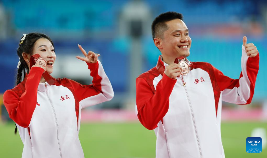 Bronze medalist Shi Linqi of Anhui and her coach pose during the awarding ceremony of the women's 100m of athletics at China's 15th National Games in Guangzhou, south China's Guangdong Province, Nov. 17, 2025. (Xinhua/Huang Wei)