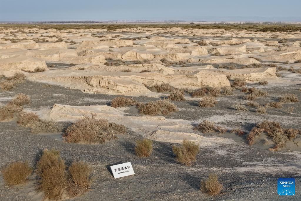 A drone photo taken on Nov. 18, 2025 shows the site of an ancient canal of an irrigation canal system in Guazhou County, Jiuquan City, northwest China's Gansu Province. Located in the Gobi Desert to the southeast of today's Suoyang Town, the ruins of Suoyang City, which used to play a pivot role in boarder defense and transportation in the olden times, consist of the Suoyang City site, the Ta'er temple, remains of an irrigation canal system, and a group of tombs.