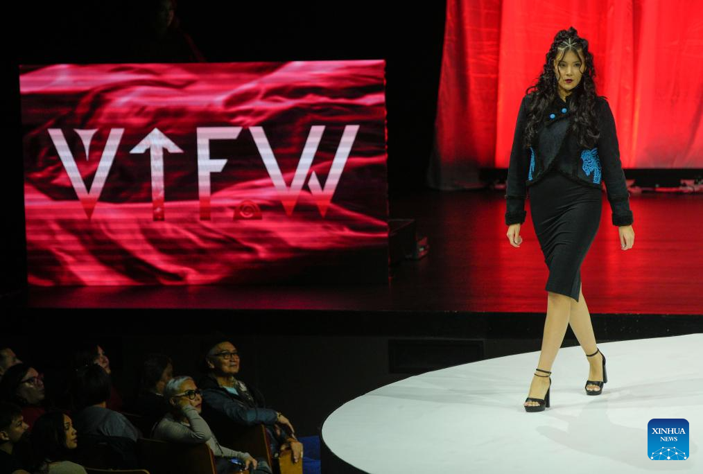 Models present creations during the runway show at Vancouver Indigenous Fashion Week 2025 in Vancouver, British Columbia, Canada, Nov. 19, 2025. (Photo by Liang Sen/Xinhua)