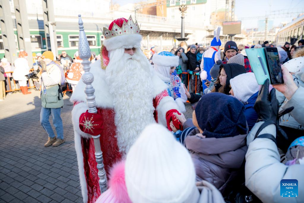 Performers playing the roles of "Father Frost" and "Snow Maiden" interact with the audience in Vladivostok, Russia, Nov. 19, 2025. To celebrate Christmas and the New Year, the "Father Frost" train departed from Vladivostok on Nov. 19, embarking on a tour across Russia. The train will pass through approximately 70 cities in Russia, eventually arriving in Veliky Ustyugh, the hometown of "Father Frost." (Photo by Andrey Matveenko/Xinhua)