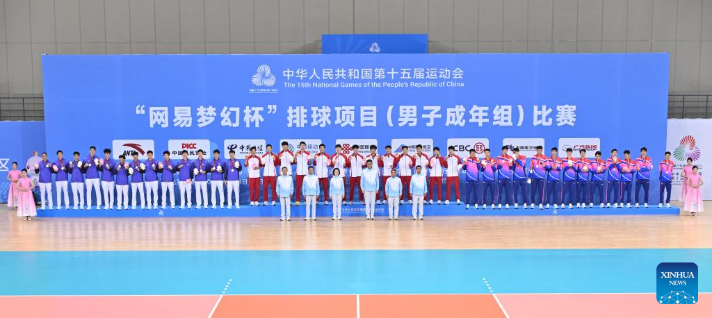 Gold medalists team Shandong, silver medalists team Fujian and bronze medalists team Shanghai pose during the awarding ceremony for the volleyball men's at China's 15th National Games in Jiangmen, south China's Guangdong Province, Nov. 20, 2025. (Xinhua/Li Xin)