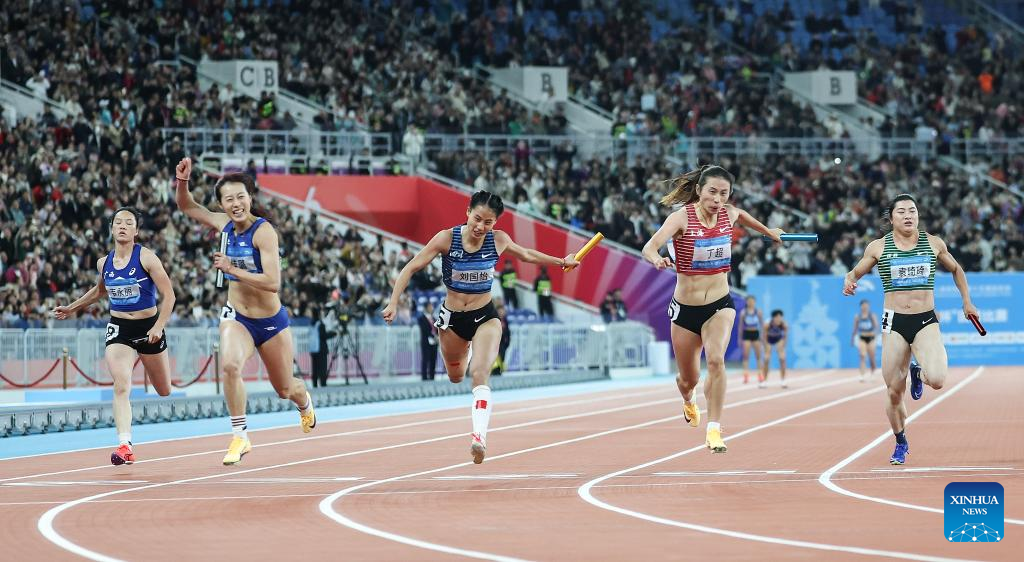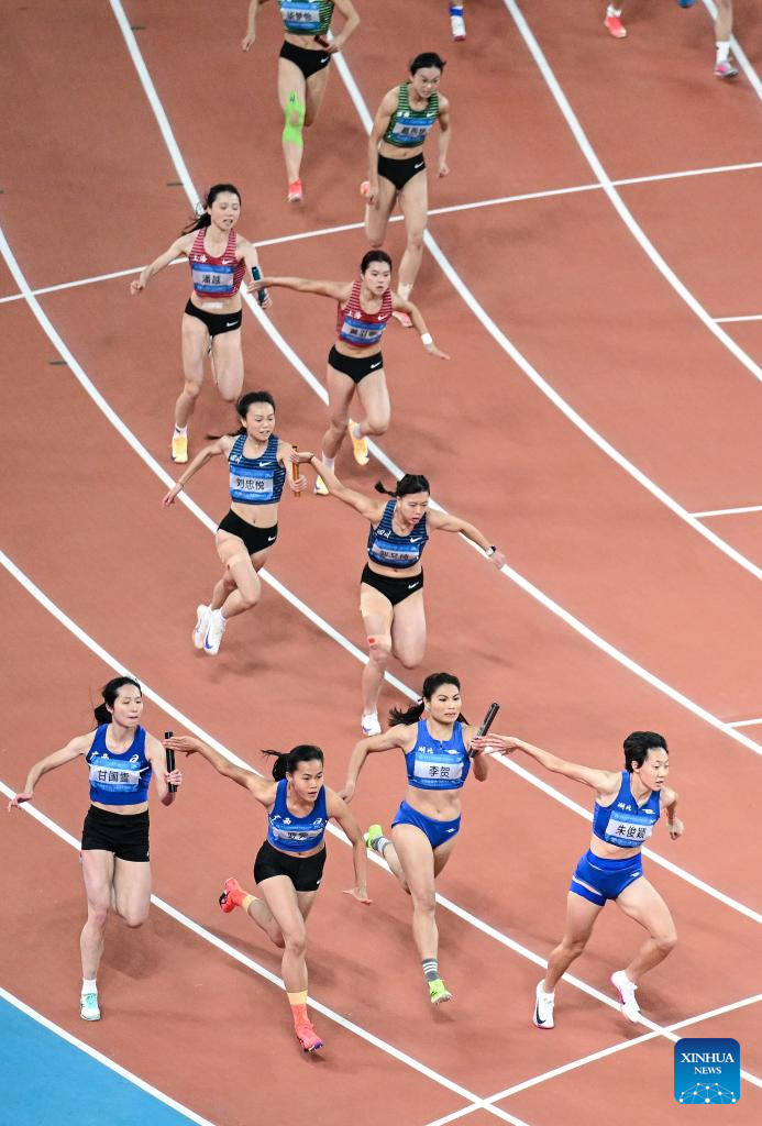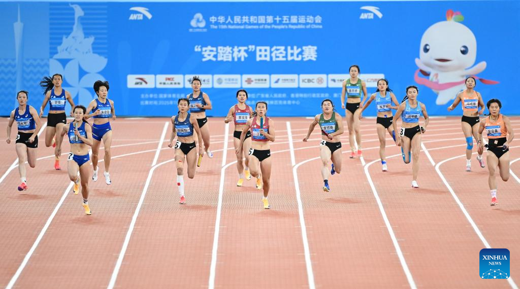 Athletes compete during the women's 4x100m relay final of athletics at China's 15th National Games in Guangzhou, south China's Guangdong Province, Nov. 20, 2025. (Xinhua/Deng Hua)