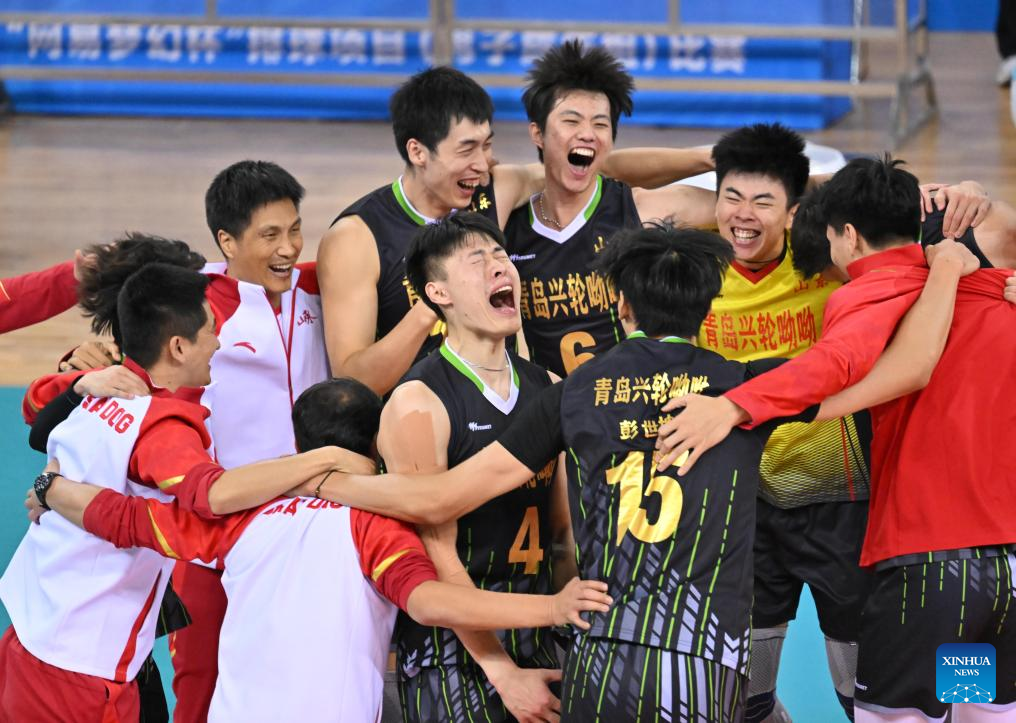 Team Shandong celebrate after the volleyball men's final between Fujian and Shandong at China's 15th National Games in Jiangmen, south China's Guangdong Province, Nov. 20, 2025. (Xinhua/Li Xin)