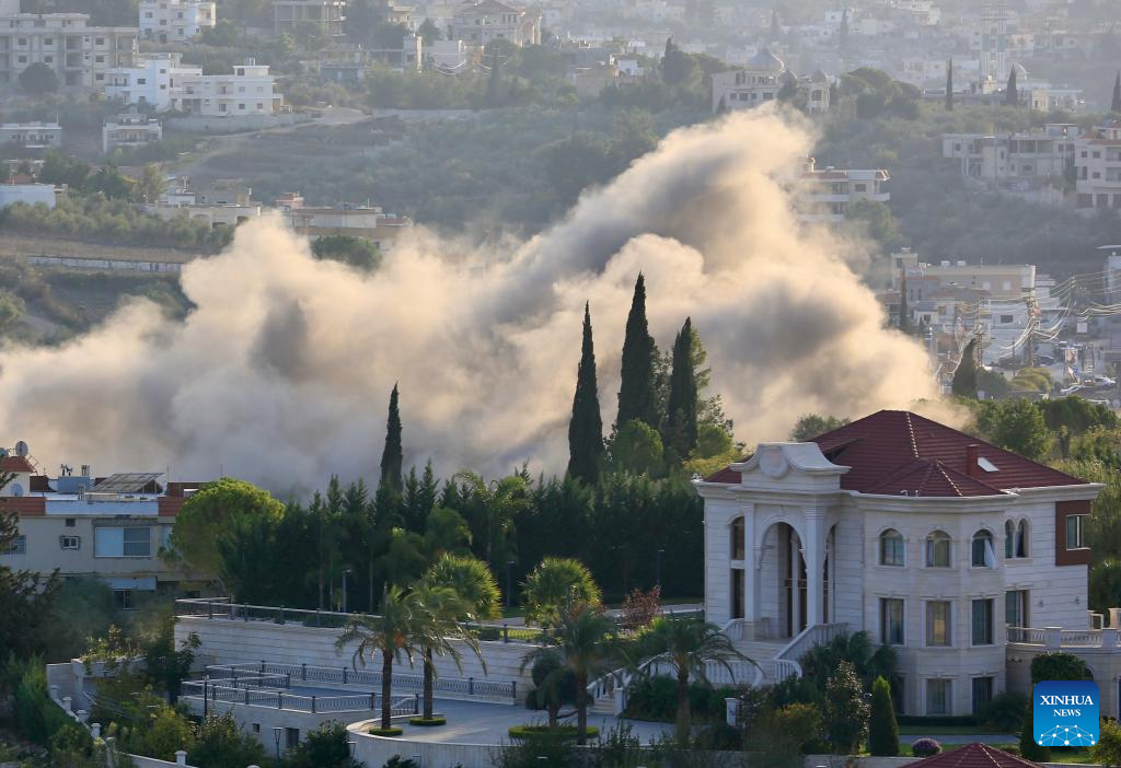This photo taken on Nov. 19, 2025 shows smoke rising from buildings following Israeli airstrikes in Deir Kifa, southern Lebanon. (Photo by Ali Hashisho/Xinhua)