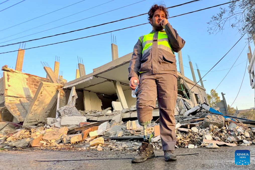 A medical worker with a prosthetic limb stands in front of the ruins of a building destroyed by Israeli airstrikes in Deir Kifa, southern Lebanon, Nov. 19, 2025. (Photo by Ali Hashisho/Xinhua)