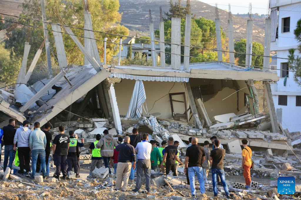 Lebanese citizens check the ruins of a building destroyed by Israeli airstrikes in Deir Kifa, southern Lebanon, Nov. 19, 2025. (Photo by Ali Hashisho/Xinhua)