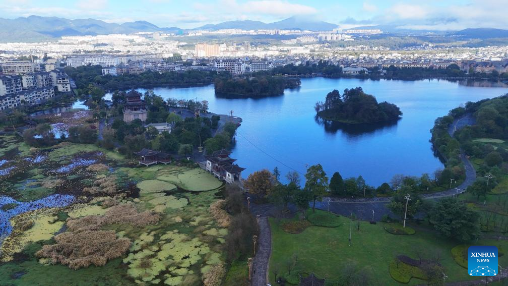 An aerial drone photo taken on Nov. 20, 2025 shows a view of the Shanghu national urban wetland park in Changshu, east China's Jiangsu Province. (Photo by Wang Xuzhong/Xinhua)