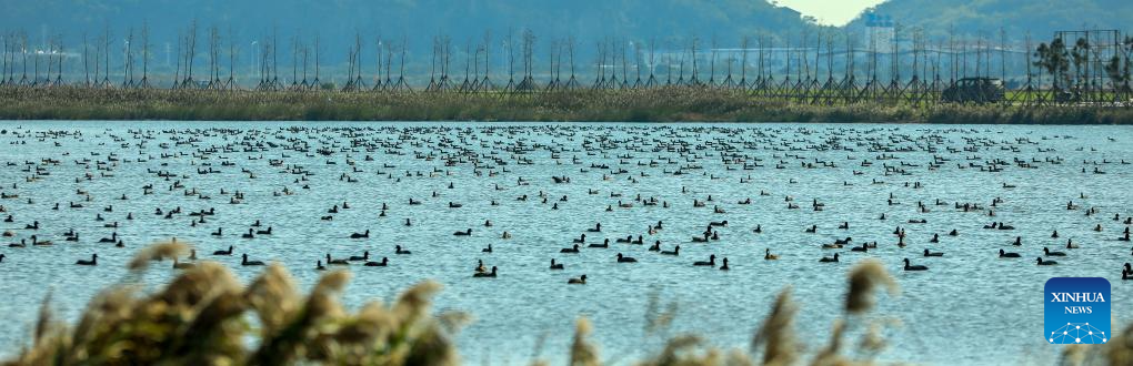 Migratory birds are pictured at a seaside scenic spot in Wenling City, east China's Zhejiang Province, Nov. 20, 2025. (Photo by Zhou Xuejun/Xinhua)